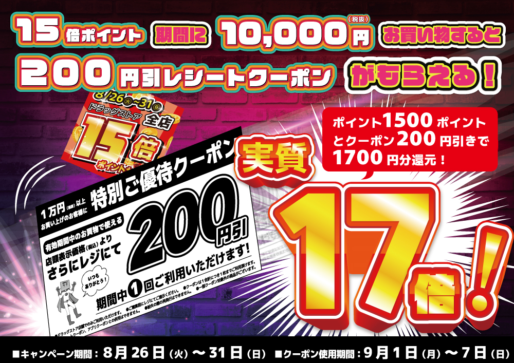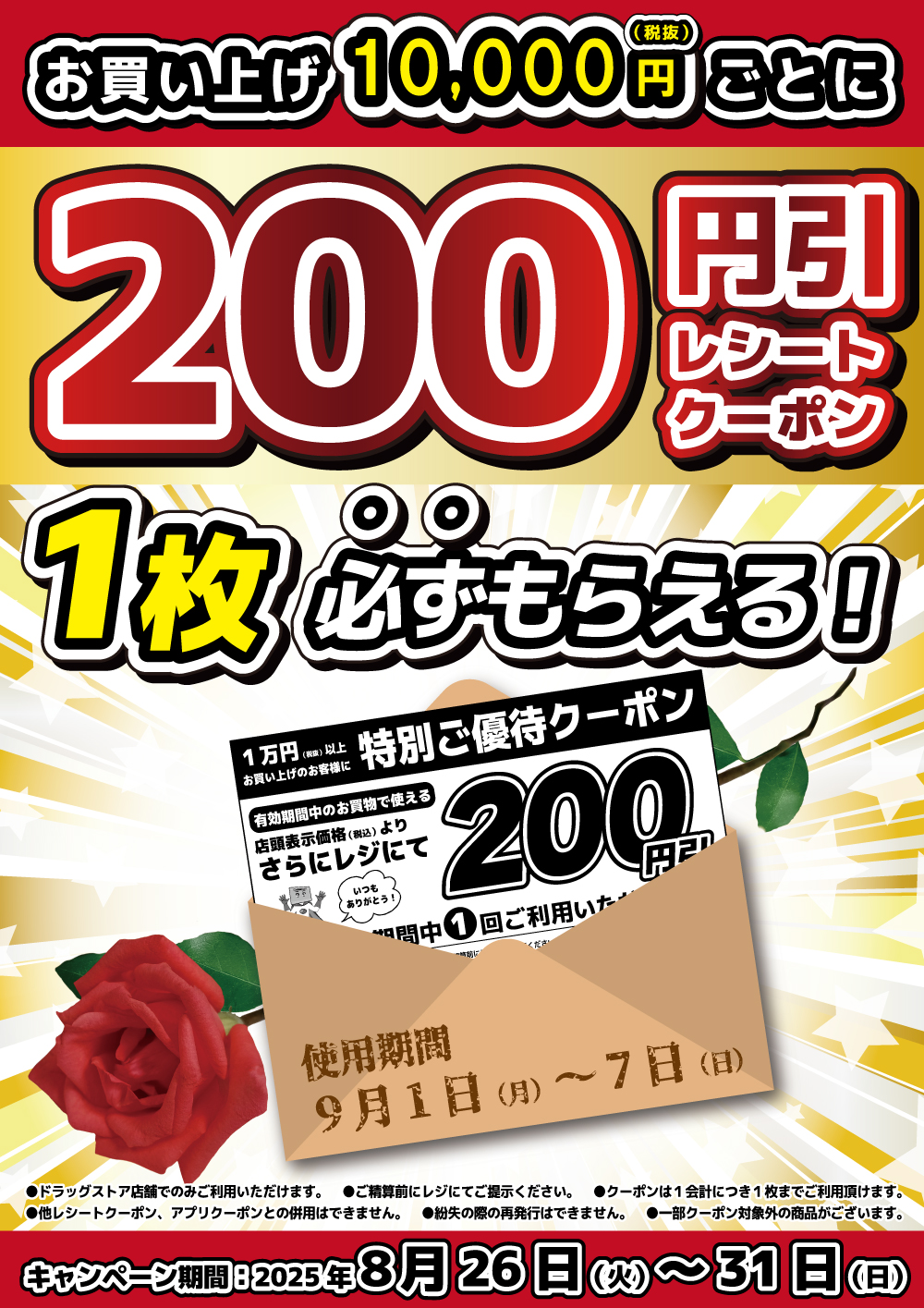 キャンペーン期間中にお買い上げ金額が税抜10,000円ごとに使用期間中に使える200円引レシートクーポンを必ず1枚をプレゼント!