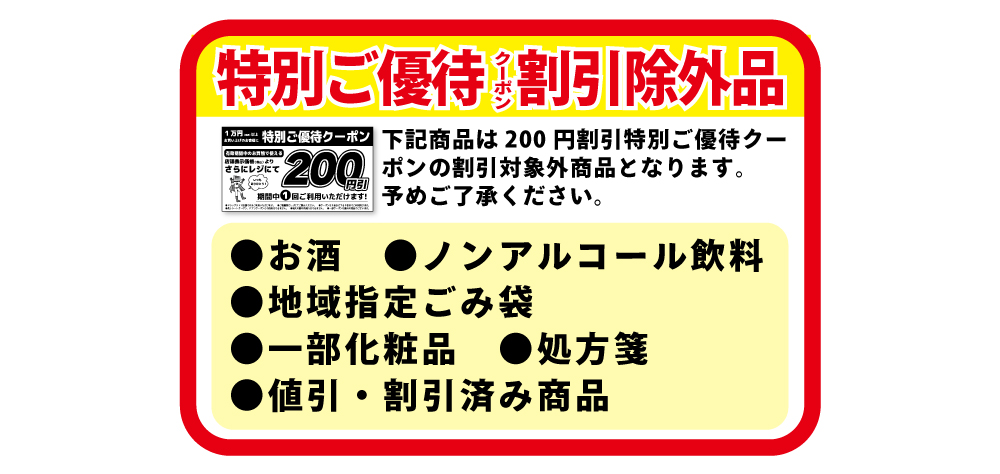 ●1回のお買い物で、税抜10,000円以上の場合、10,000円ごとに下記クーポン有効期間にお使いいただけるクーポン(200円引き)が、レシートと同時に発行されますので忘れずにお受け取りください。