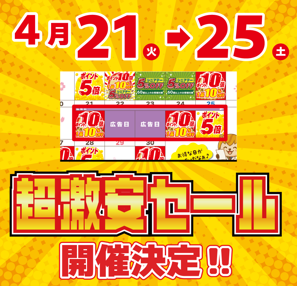 この「超激安セール」は、連休のお出かけに向けたトラベル用品や日焼け止め、おうち時間を楽しむためのレジャー用品・お菓子などを『連休前に超お得に揃える大チャンス』です。チラシの公開をどうぞお楽しみに!