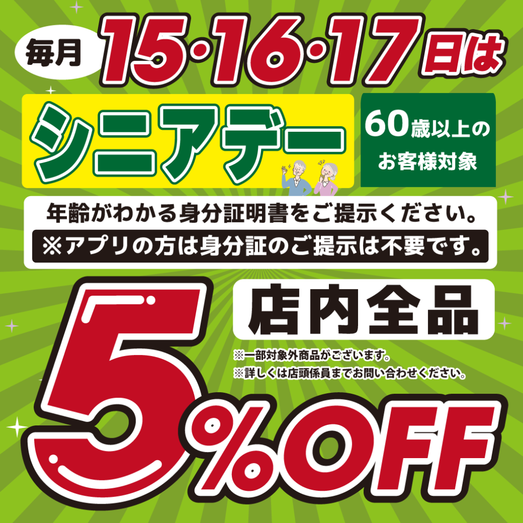 60歳以上のお客様は5%OFFでお買い物いただけます。