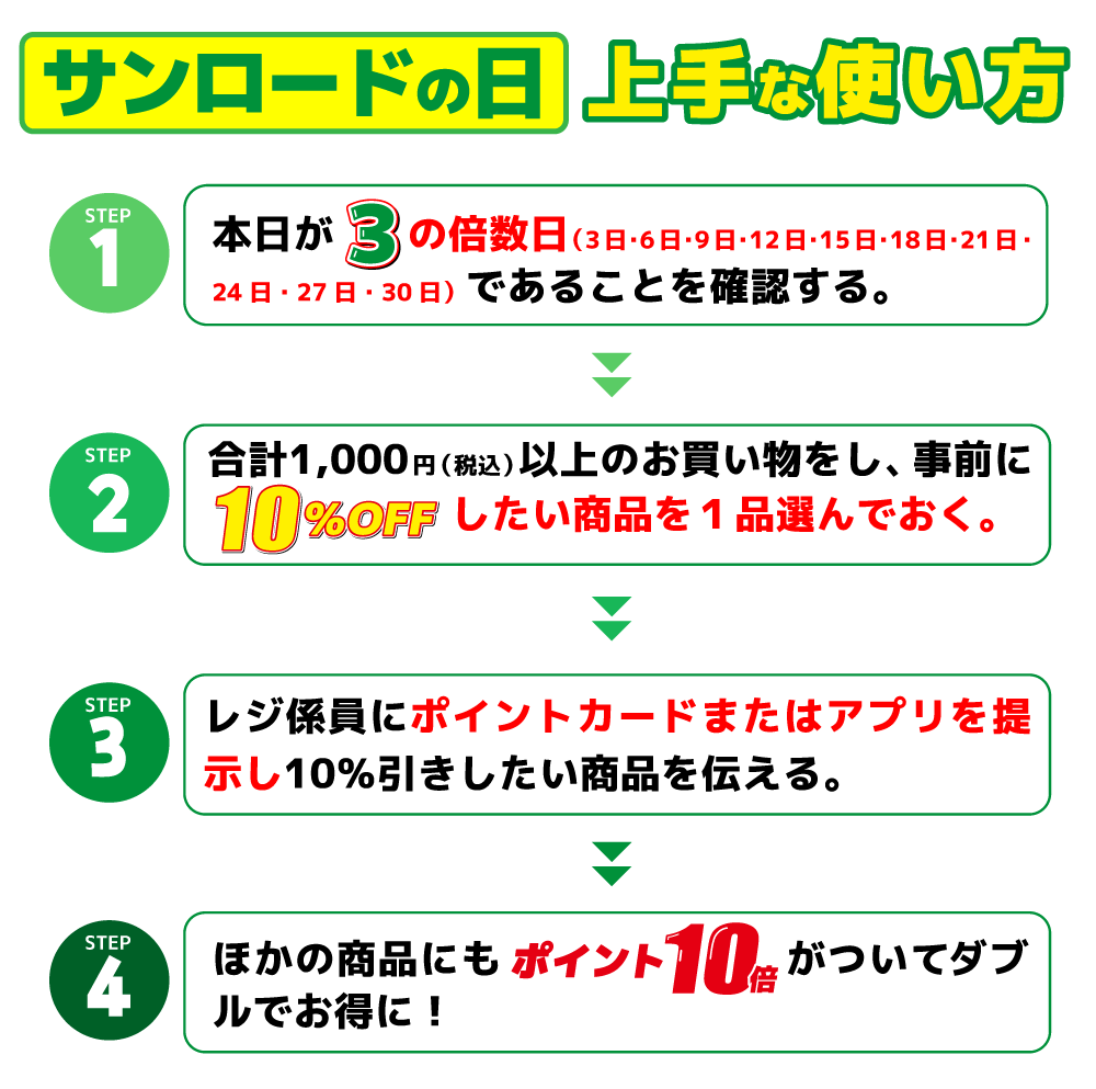 お休みの「土曜日」は、ご家族揃って1週間分の日用品をしっかりまとめ買い。そして週の半ばの「火曜日」は、足りなくなった食材や消耗品を賢く買い足し!サンロードのポイント5倍デーを活用すれば、無理なくお得な買い物サイクルが作れます。