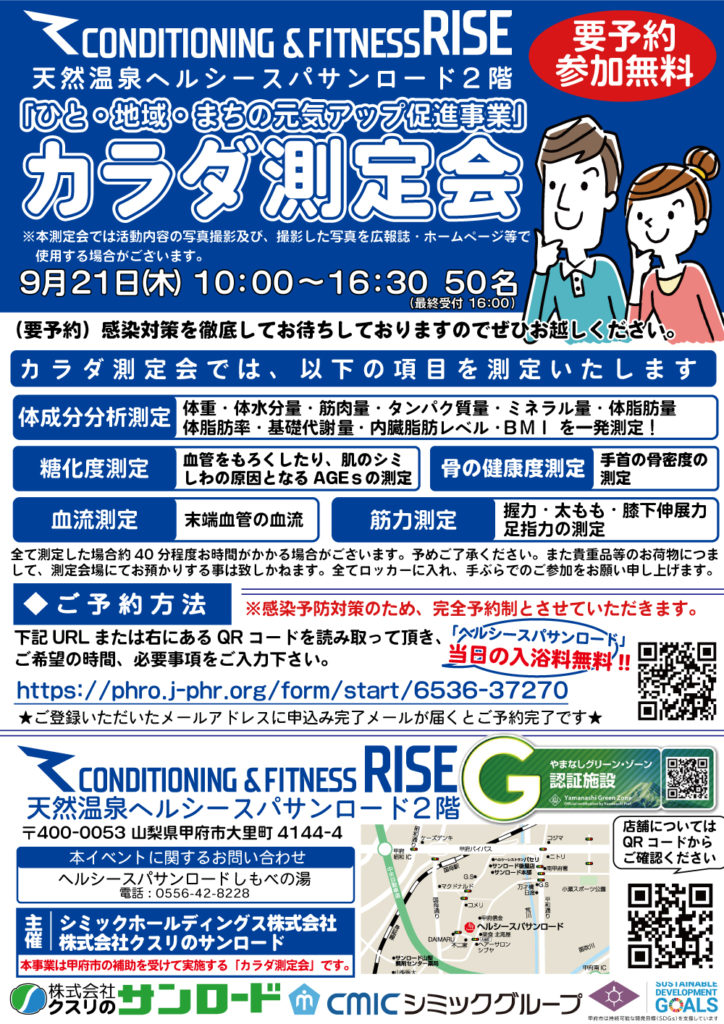9月21日(木)天然温泉ヘルシースパサンロード(大里) にてカラダ測定会を開催します