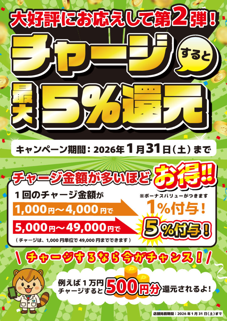 さらに!5,000円以上のチャージで《5%還元!》