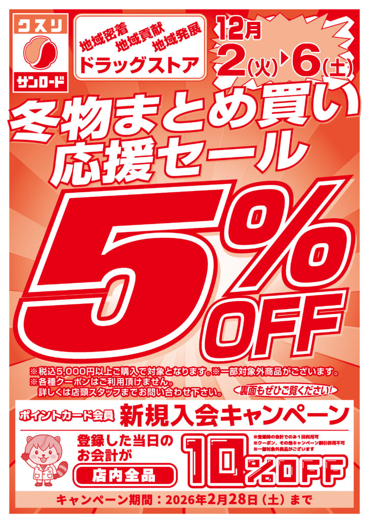 ドラッグストア全店で、5,000円以上お買い物をすると5%OFF✨