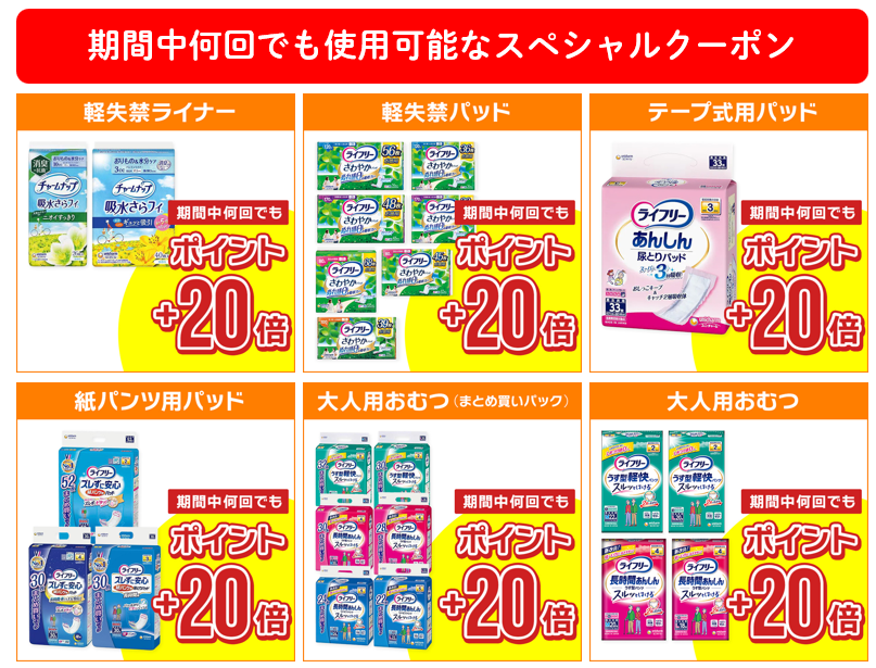 何回でも使用できる「ライフリー大人用おむつ&パッド、ポイント20倍」クーポンで、ご家族様やお友達のお買物だってお得に👌