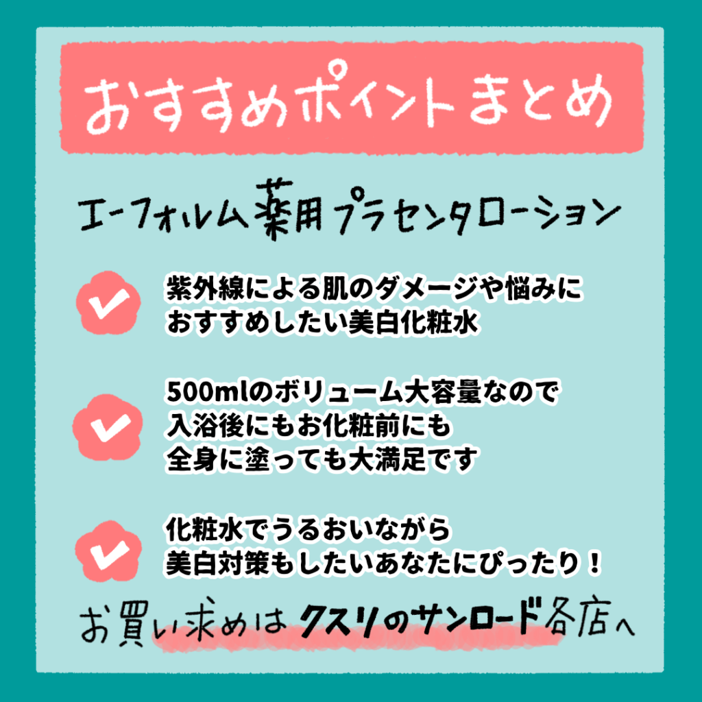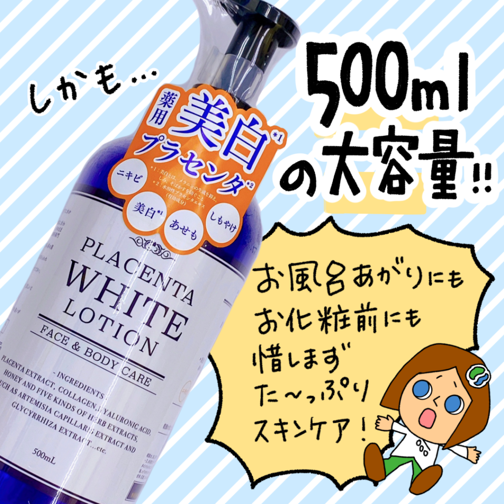 エーフォルム薬用プラセンタローションは美白効果によりシミ対策ができる上500mlの大容量の化粧水なので入浴後やお化粧前に惜しみなくスキンケアできますよ‼️