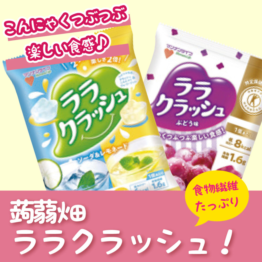 クラッシュしたこんにゃくのつぶつぶとジューシーなジュレが楽しい2つの食感が特長のララクラッシュが、今までの美味しさはそのままで「特定保健用食品」になりました。