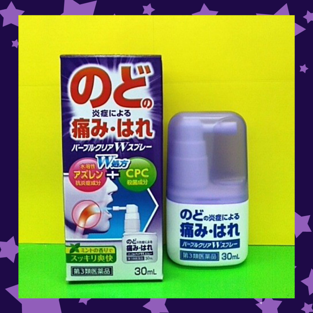 「のどが痛い、のどが腫れている、声がかれてしまった」そんな方には消炎成分と殺菌成分がダブル処方の『パープルクリアWスプレー』がおすすめです。