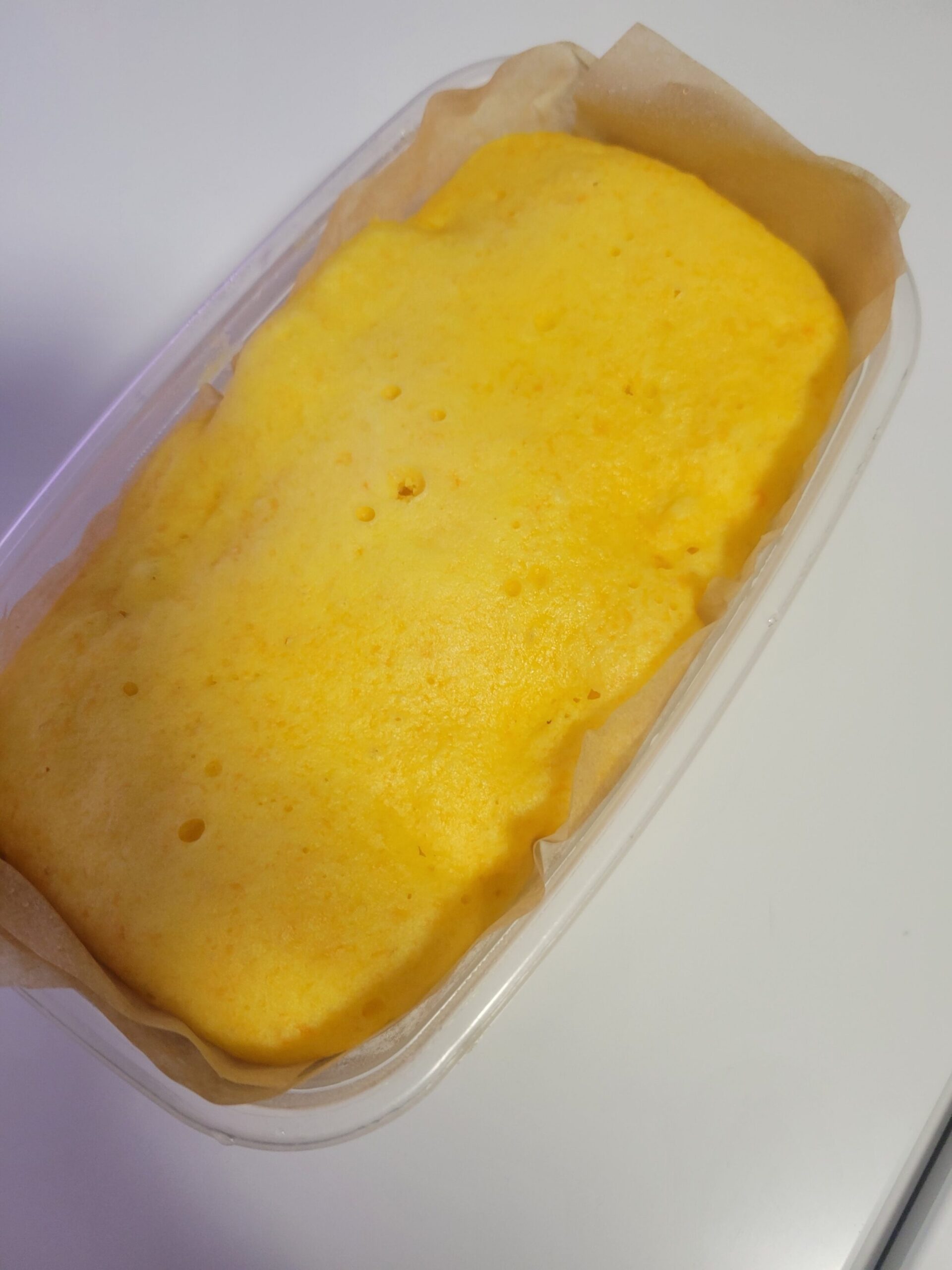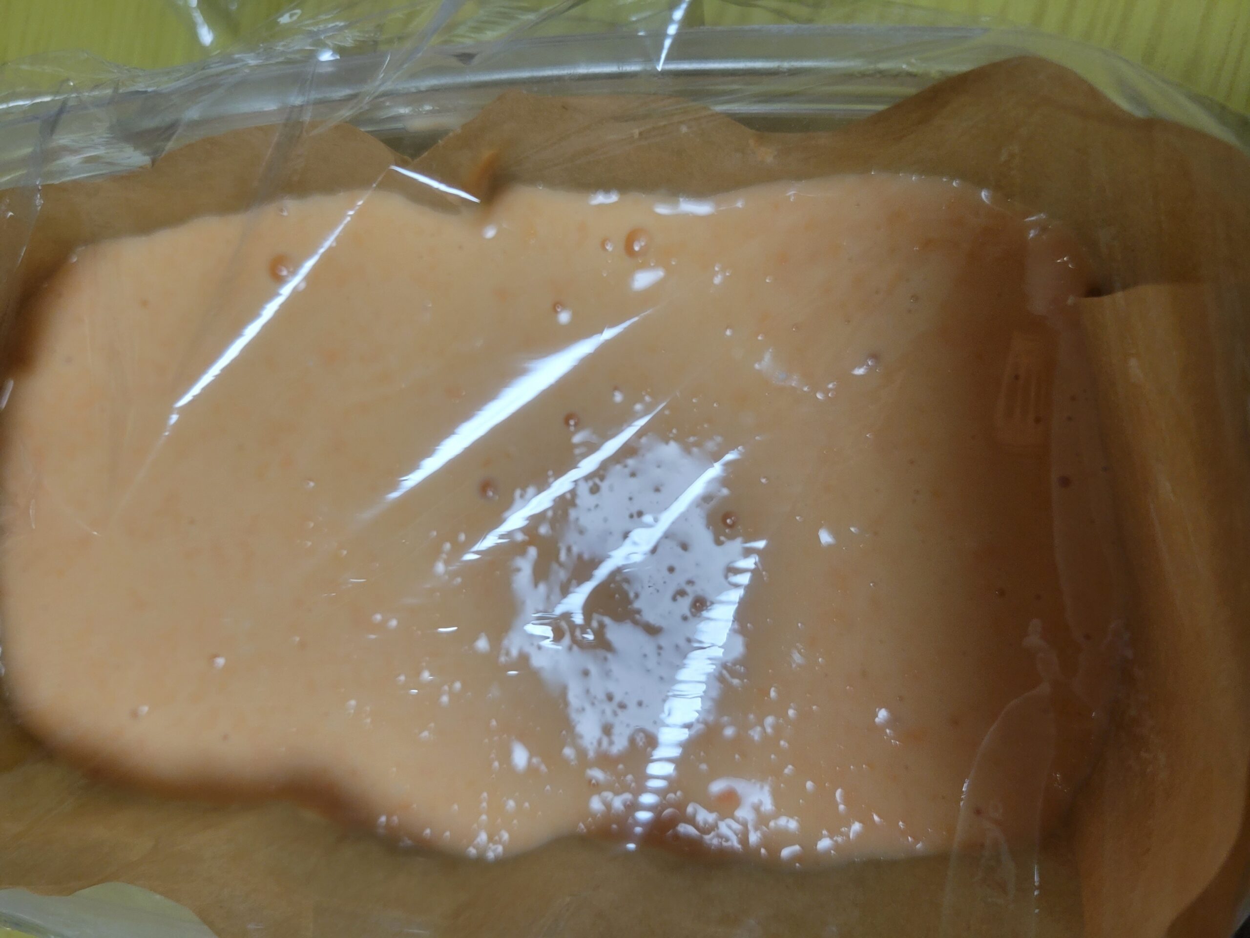 ⑤クッキングシートを敷いたタッパーに生地を流し込んでサイドを少しふんわりにラップする。