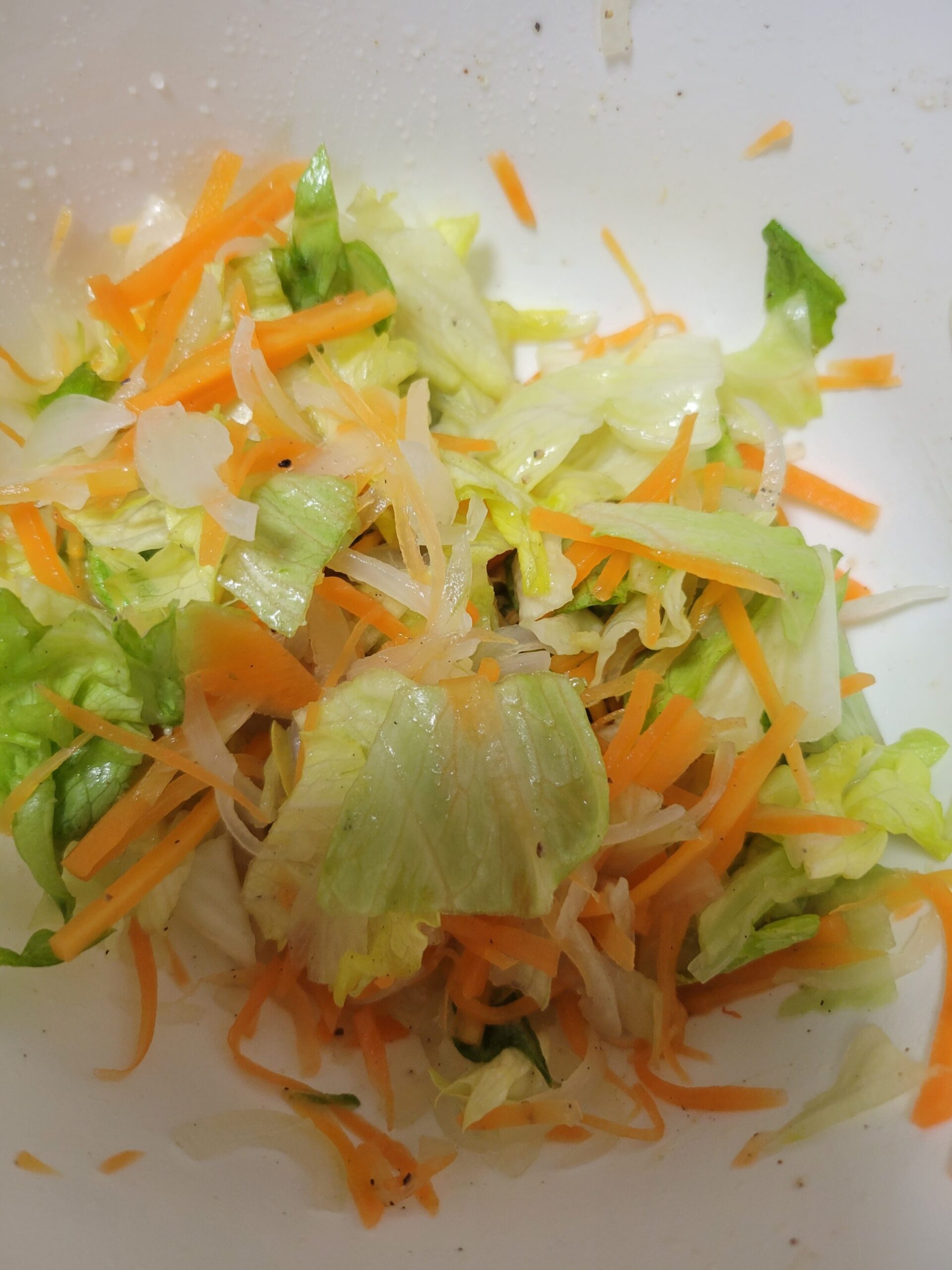 レタスはざく切り、玉ねぎは1/4の薄いスライス、人参は千切りにする。