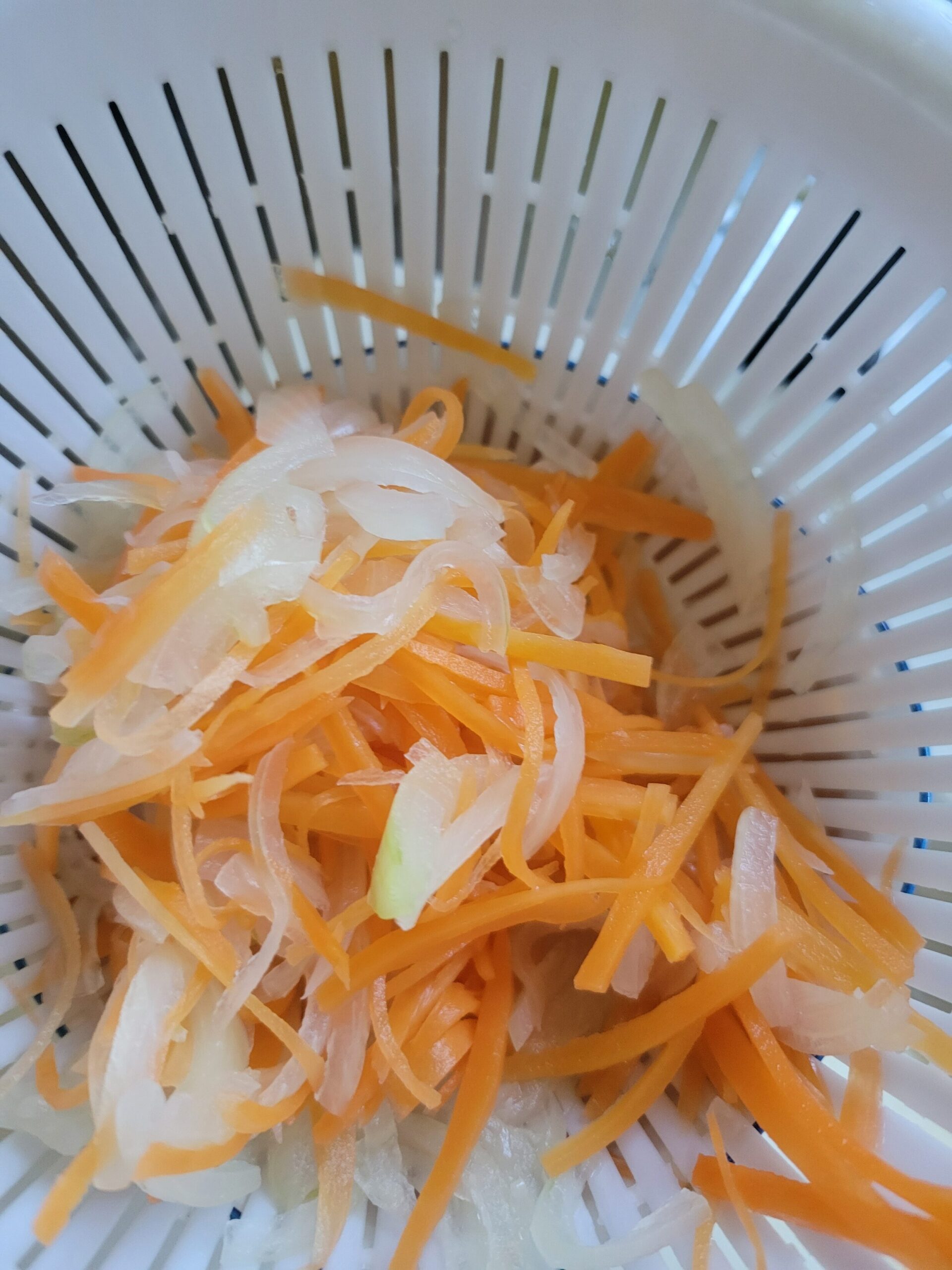 ②人参と玉ねぎはレンジで1分30秒加熱して水をかけて冷まし、ざるに上げて軽く水を切る。