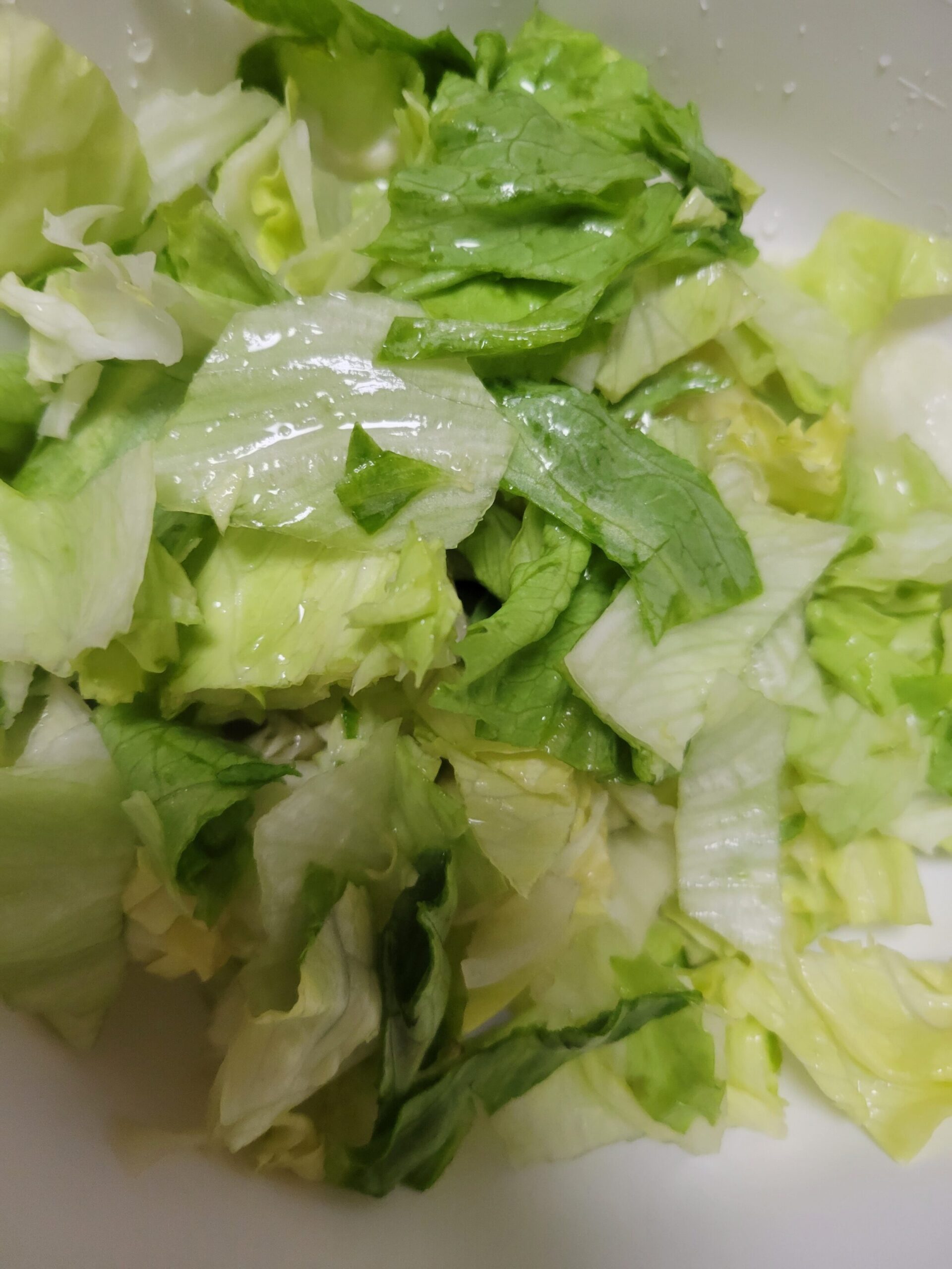 ③ボールにレタス、人参、玉ねぎを入れ、オリーブオイルとおろしにんにく、レモン汁を入れて混ぜ、あらびき塩こしょうで味を調える。