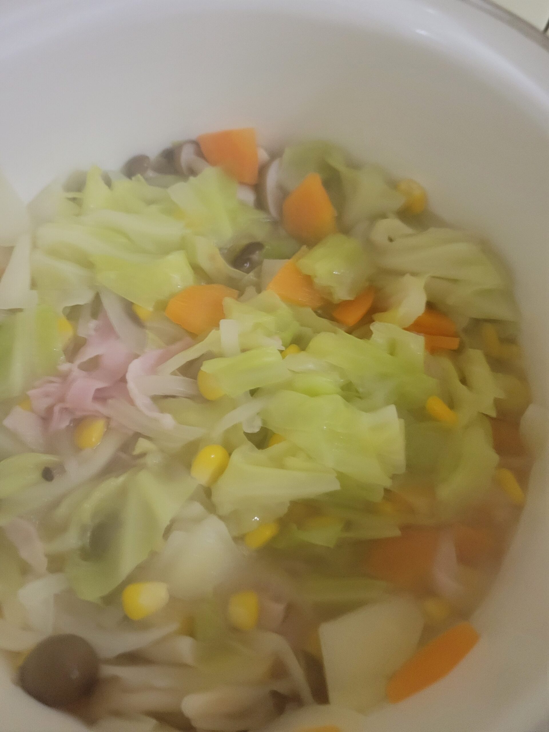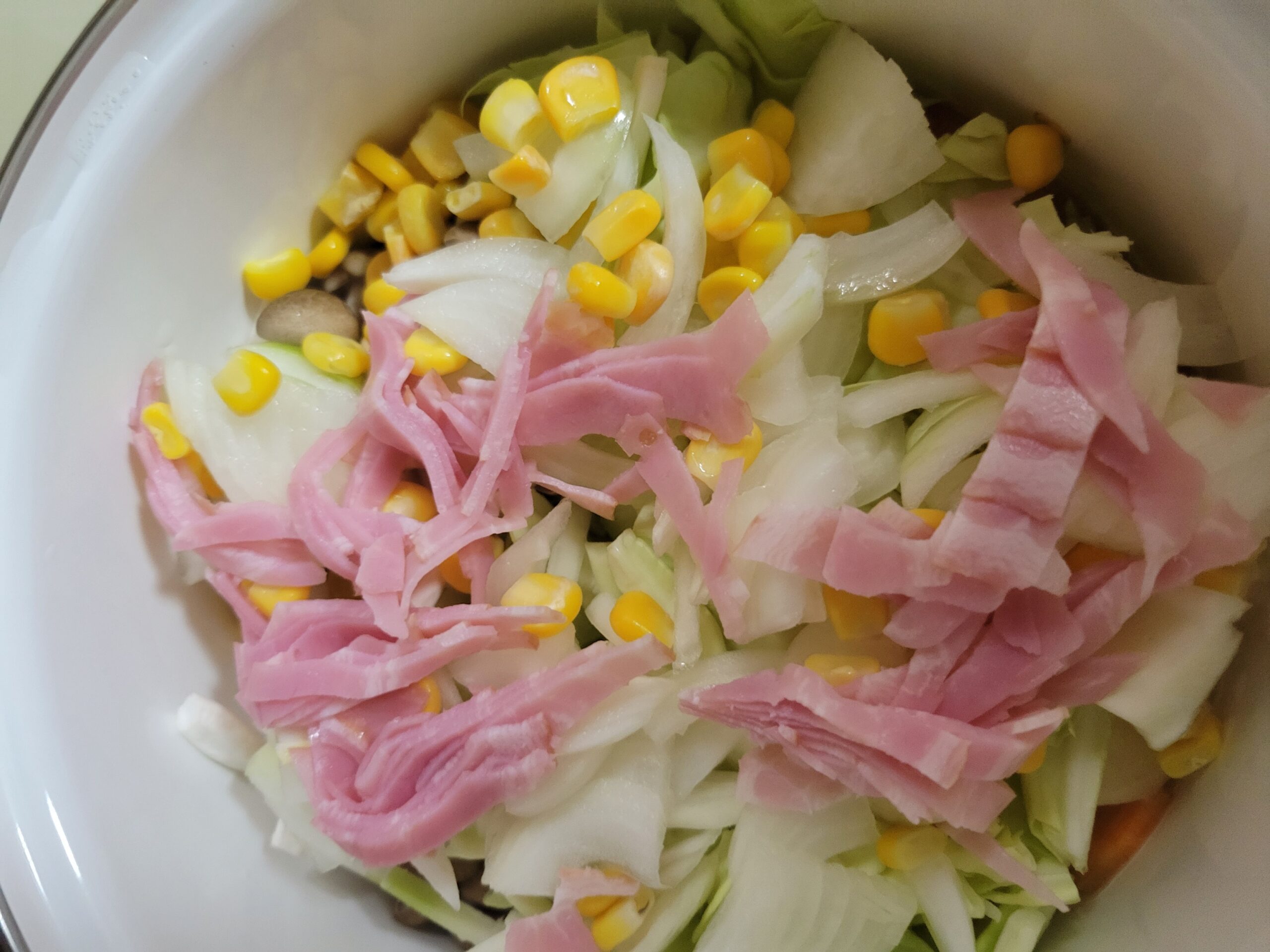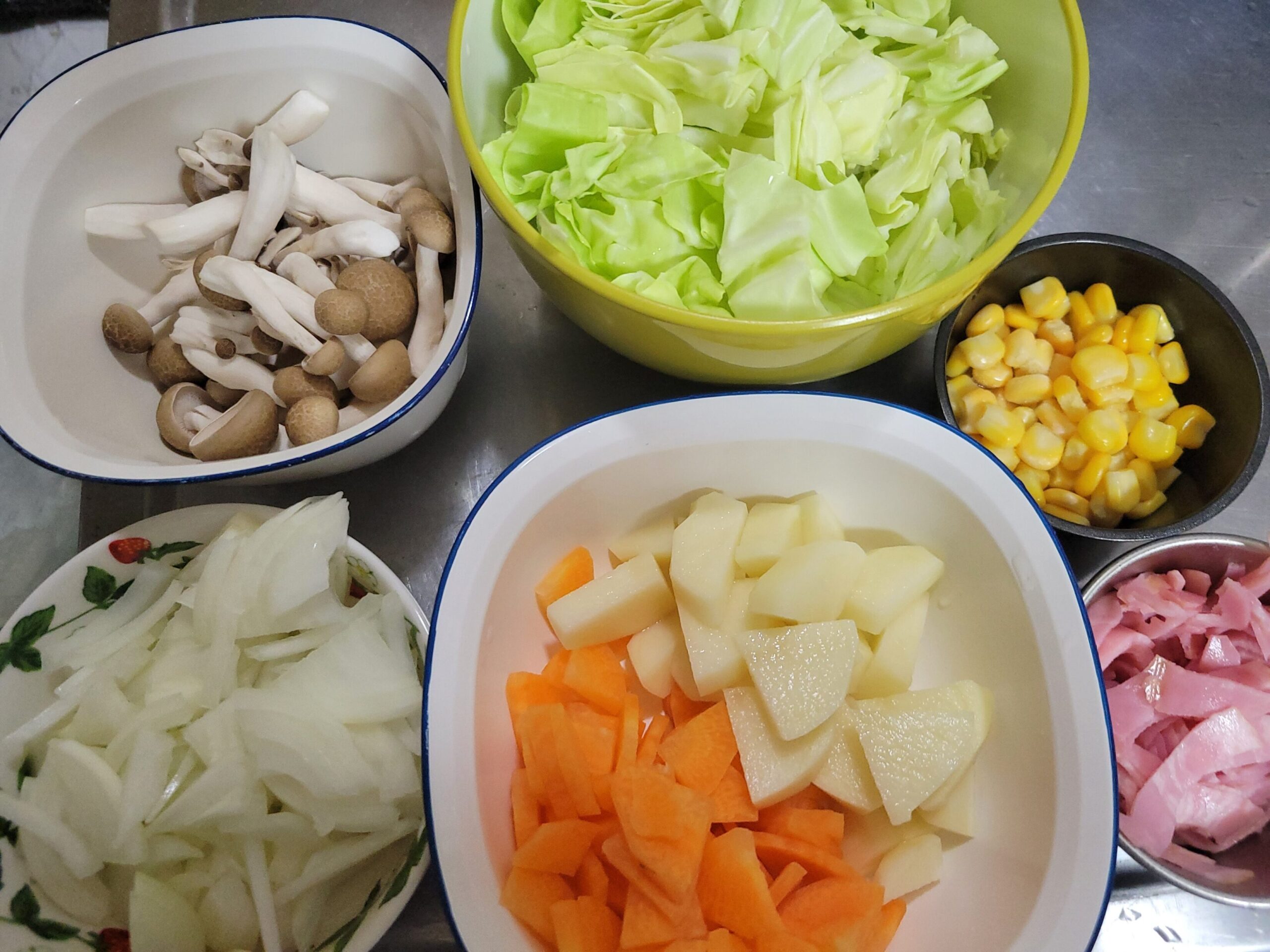 じゃがいも、にんじんは小さめのいちょう切り、キャベツはざく切り、たまねぎは1/4の薄いスライス、ベーコンは薄切り、しめじはいしづきを取って手でほぐす。