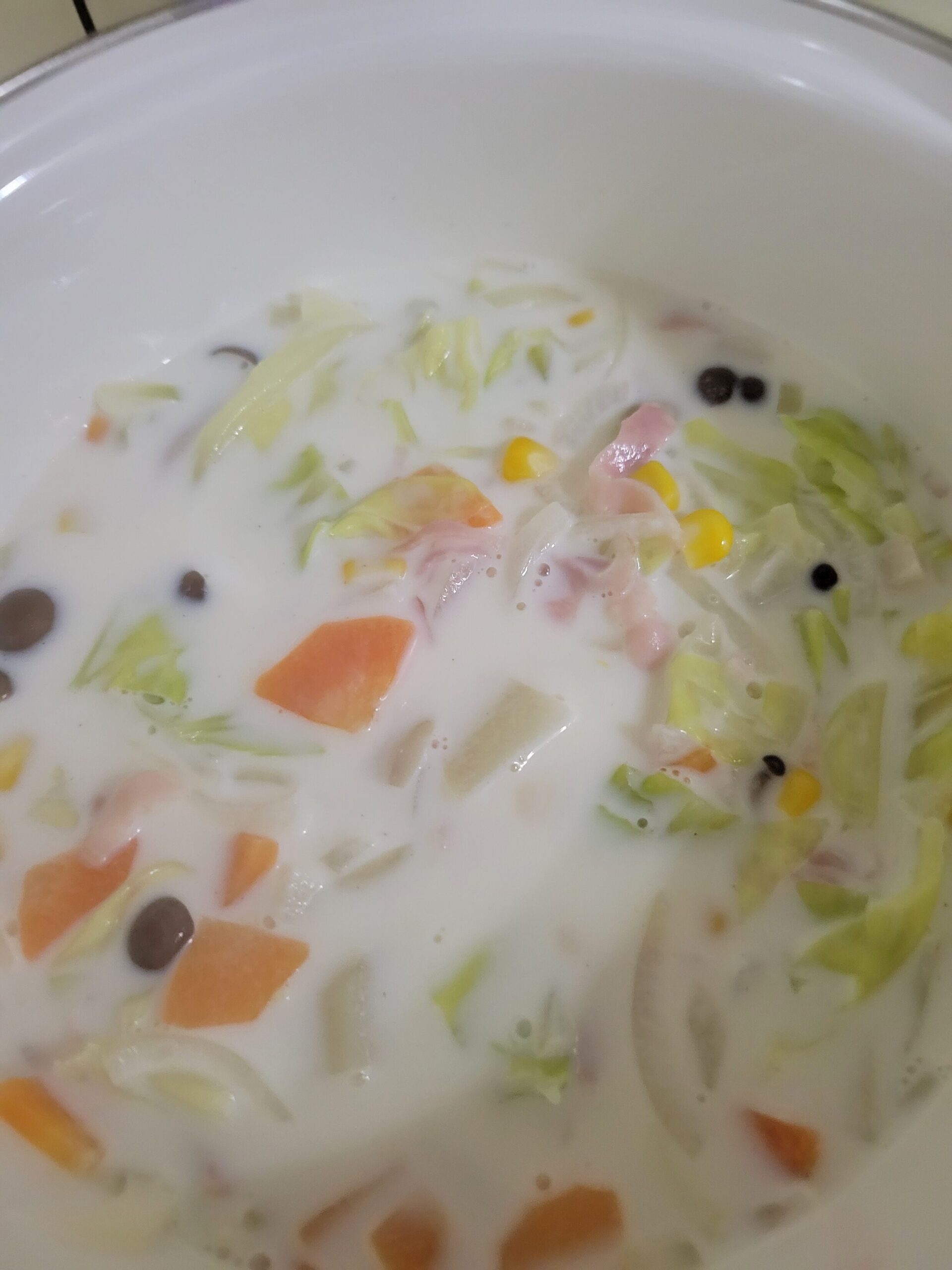 朝食にもぴったりな野菜たっぷりミルクスープです。