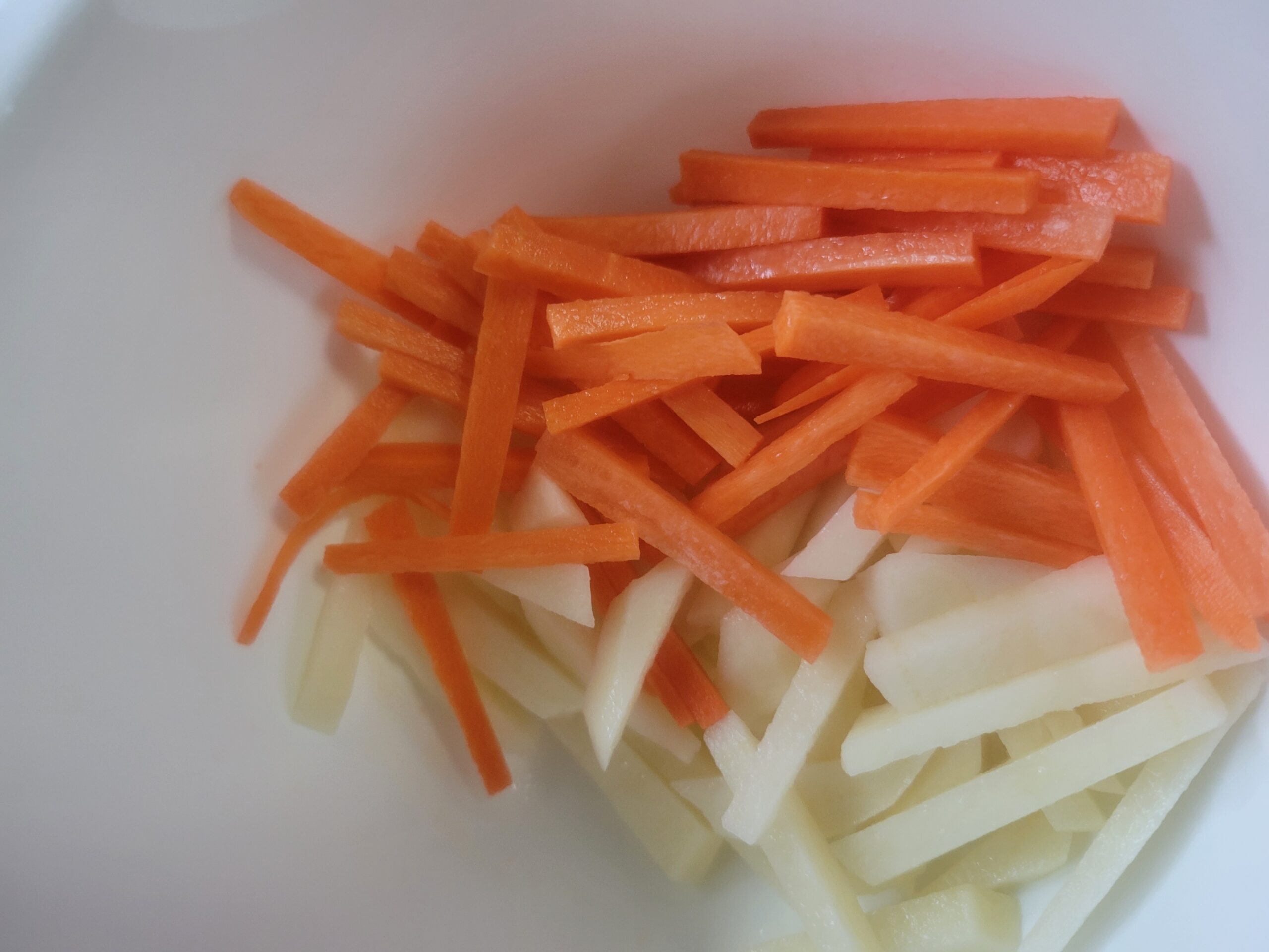 ①じゃがいも、にんじんをやや細めの拍子切りにする。人参はじゃがいもより細めにする。
