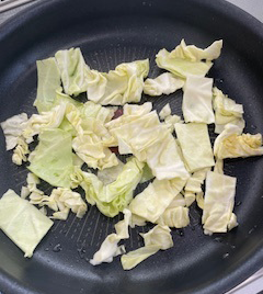 ②フライパンにサラダ油を熱し、キャベツを炒めます。