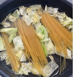 ③キャベツに火が通ったら、水を入れ強火で加熱します。沸騰したら中火にし、スパゲティを半分に折って入れ、パッケージの表記時間の通りに茹でます。