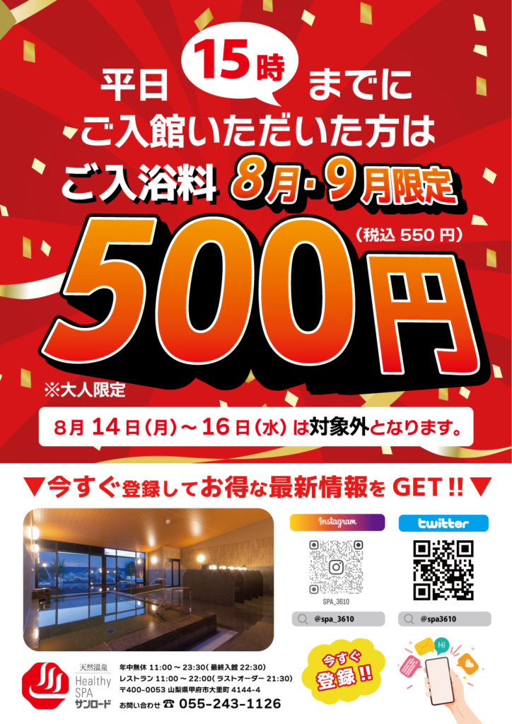 8月・9月の平日(月~金曜日)限定キャンペーン💡平日15時までにご入館いただいた方は入浴料が500円(税込550円)👏